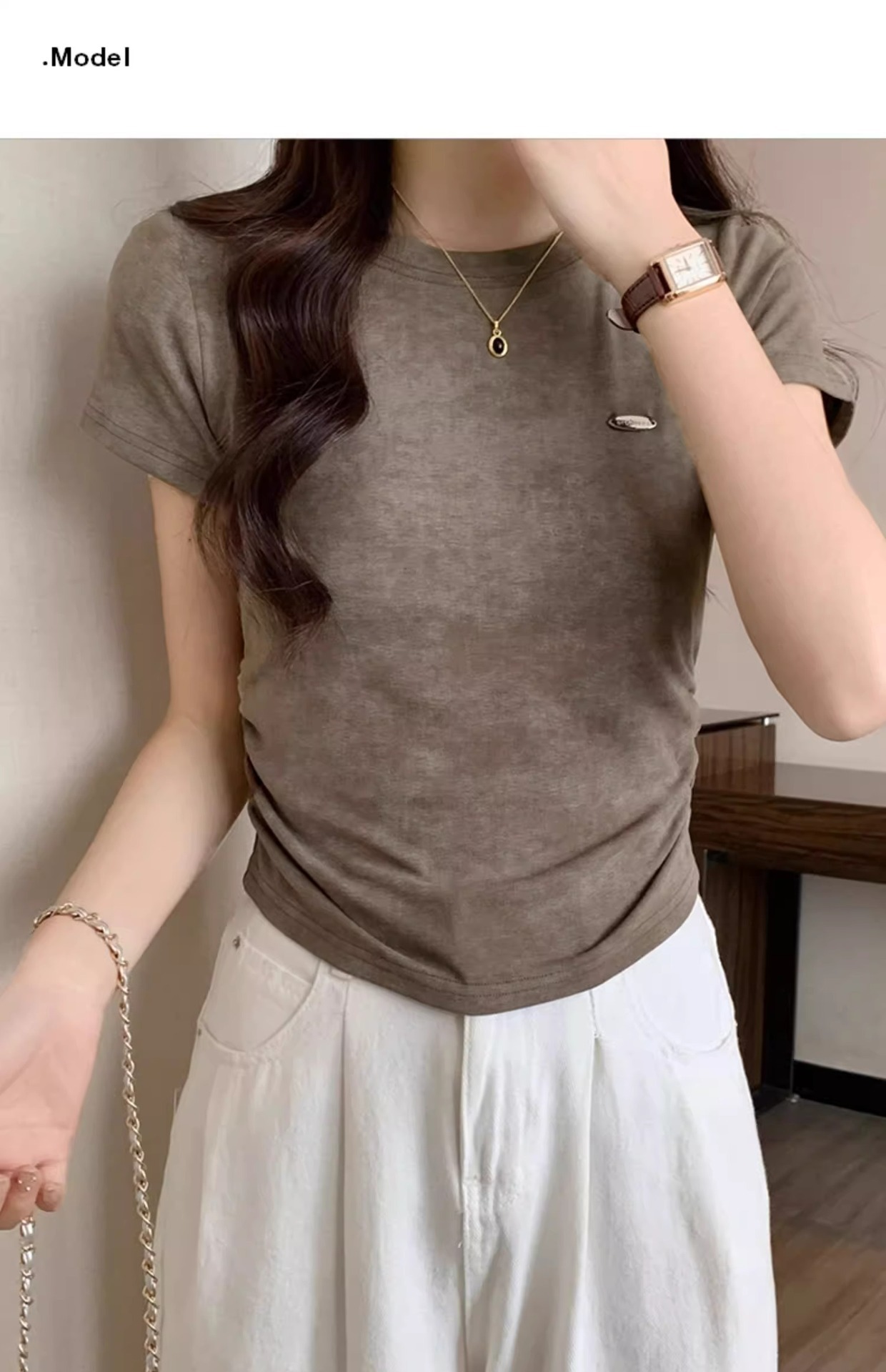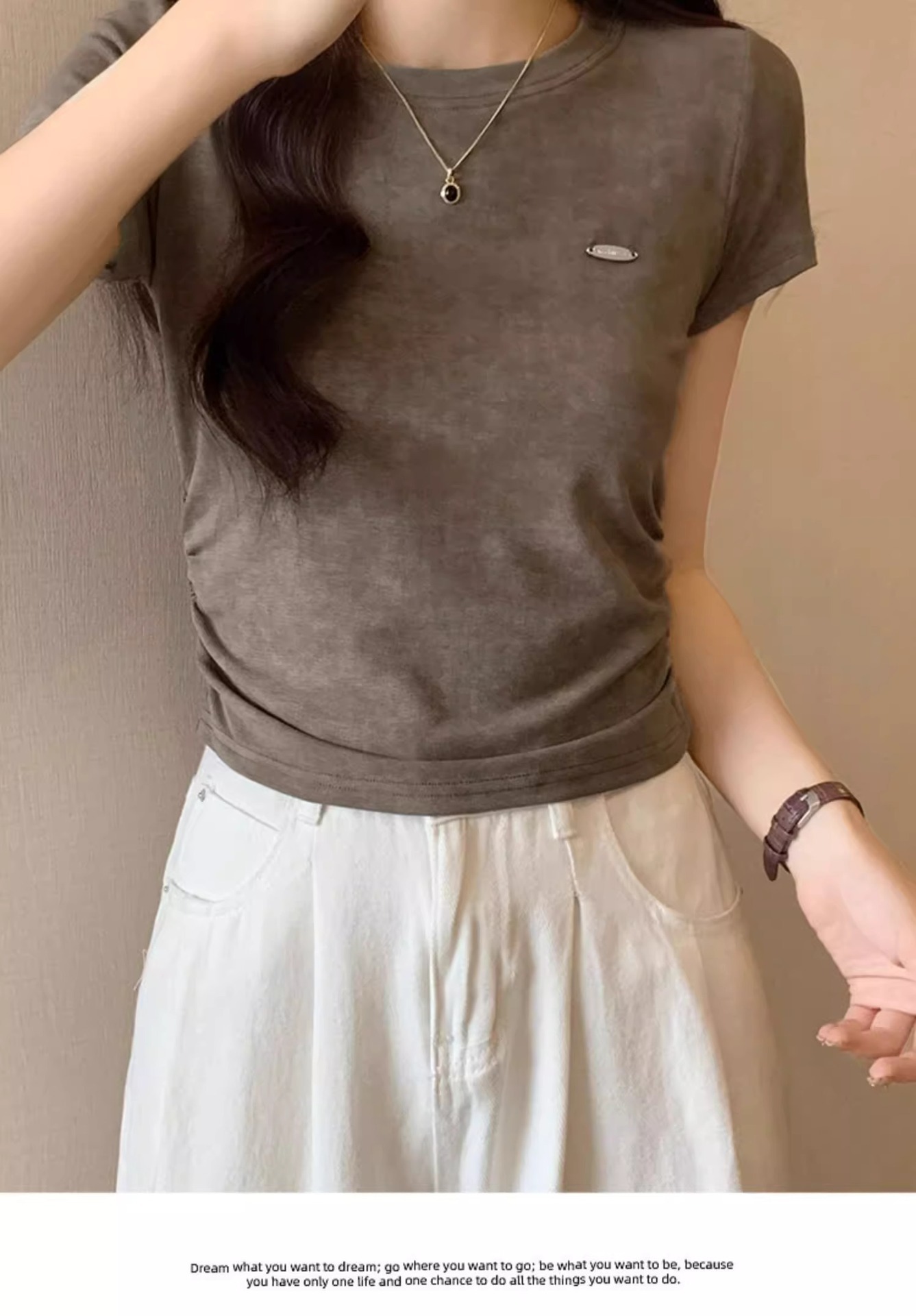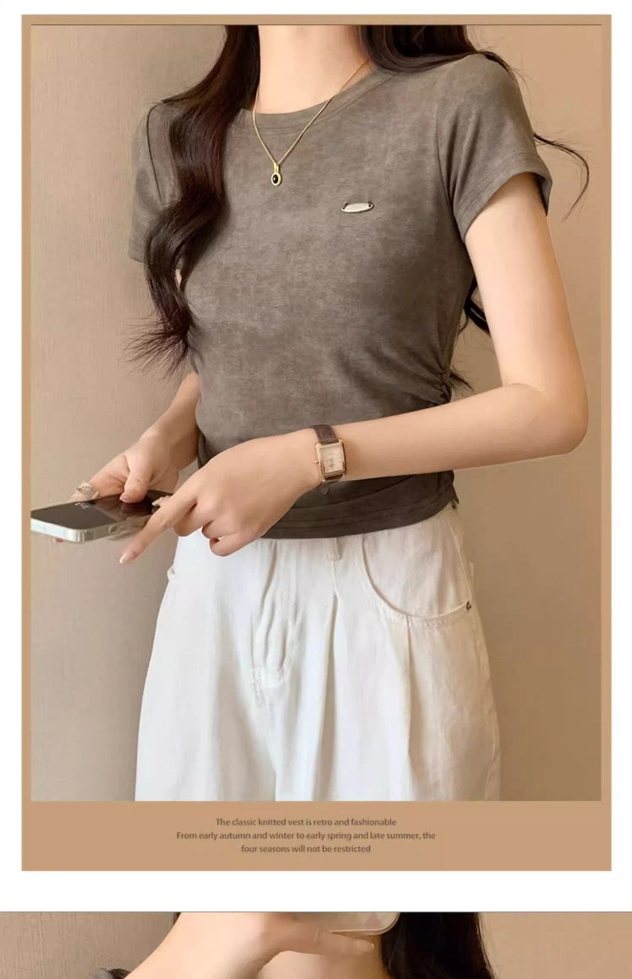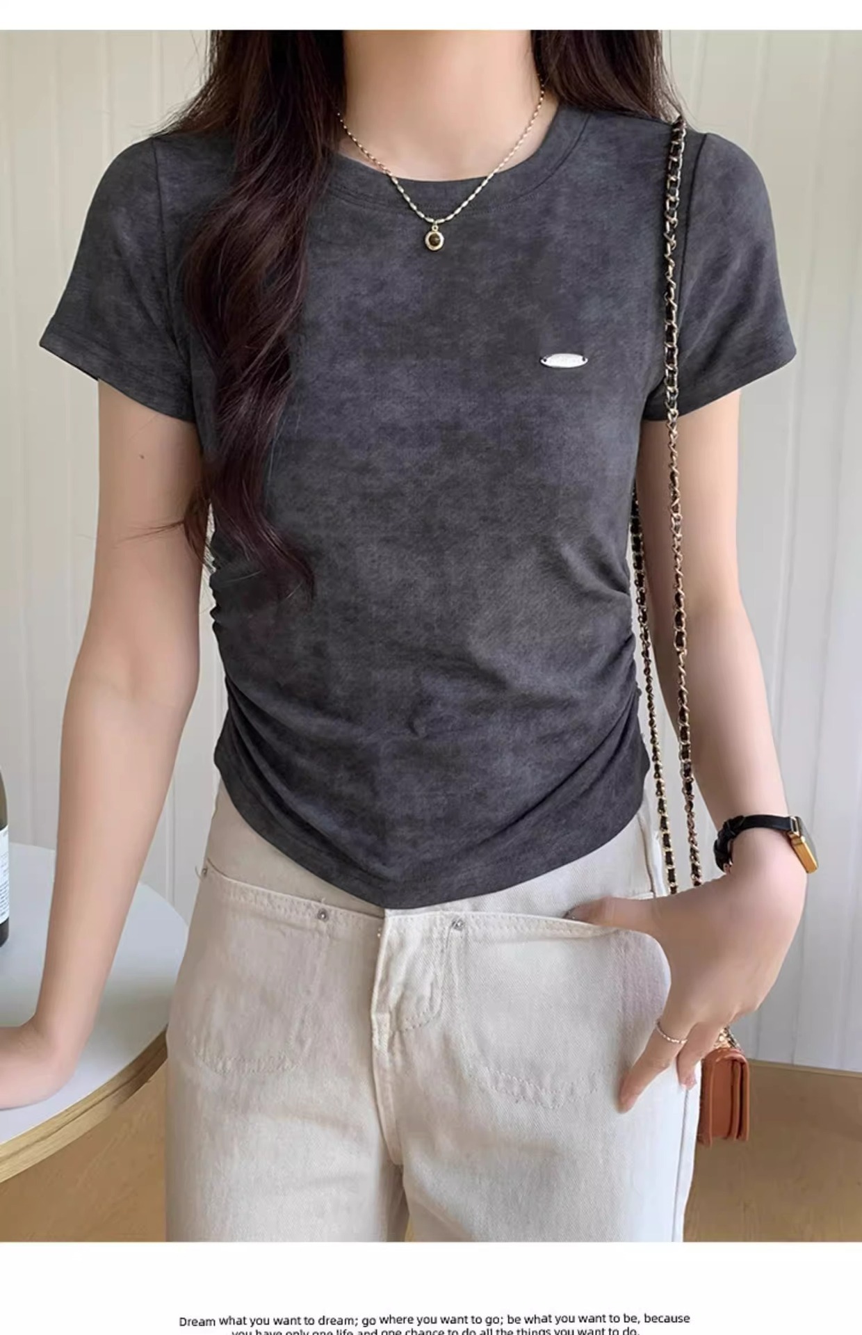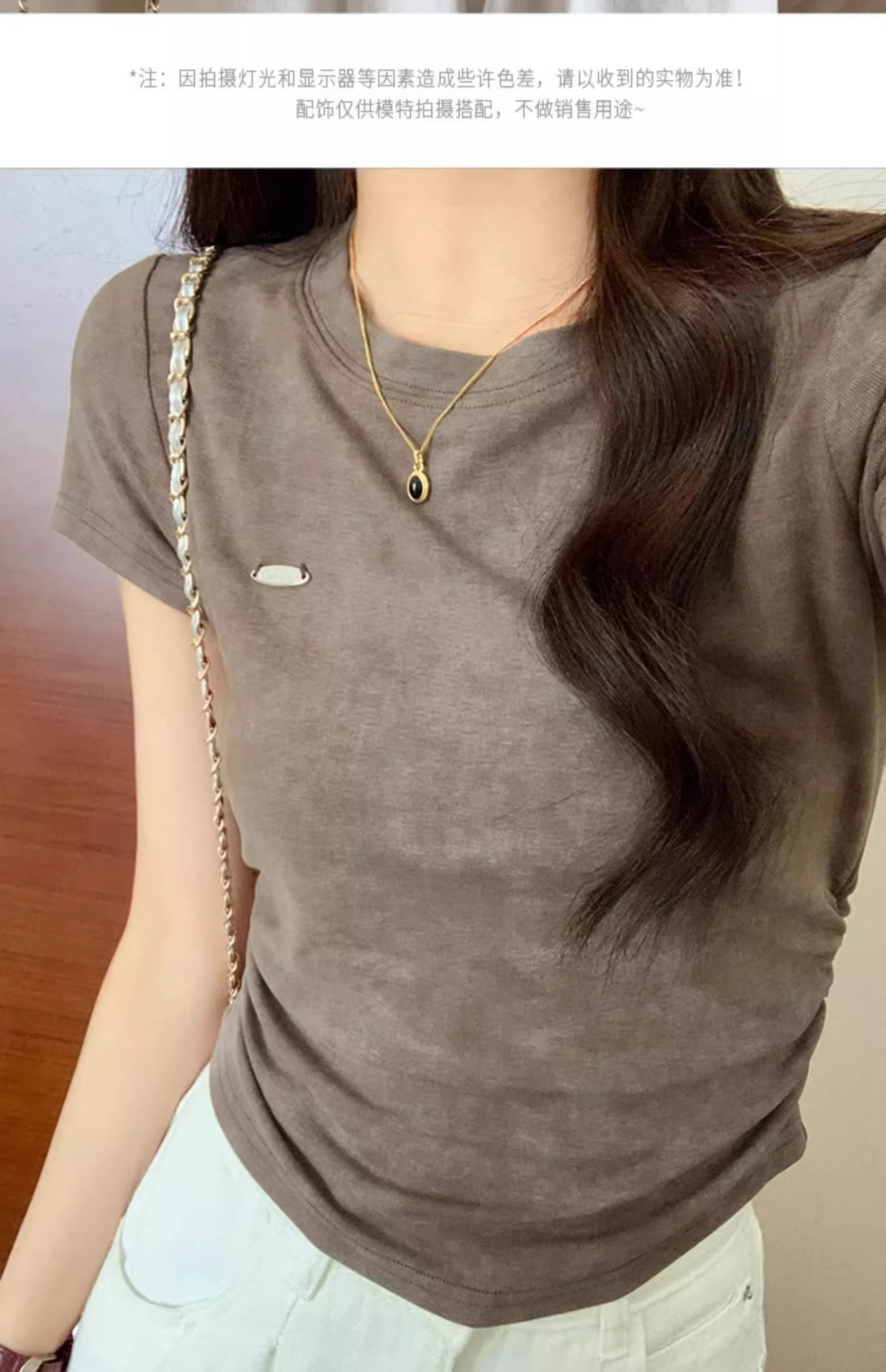 美式圆领正肩短袖t恤女春夏新款设计感抽褶收腰纯欲修身小衫上衣