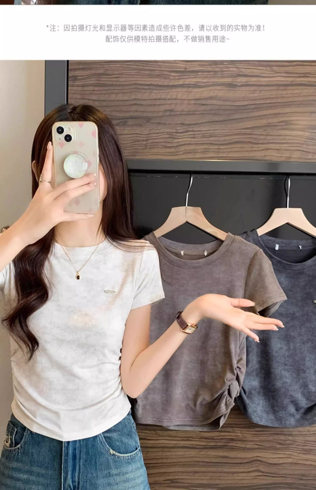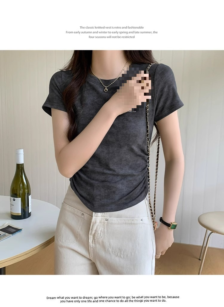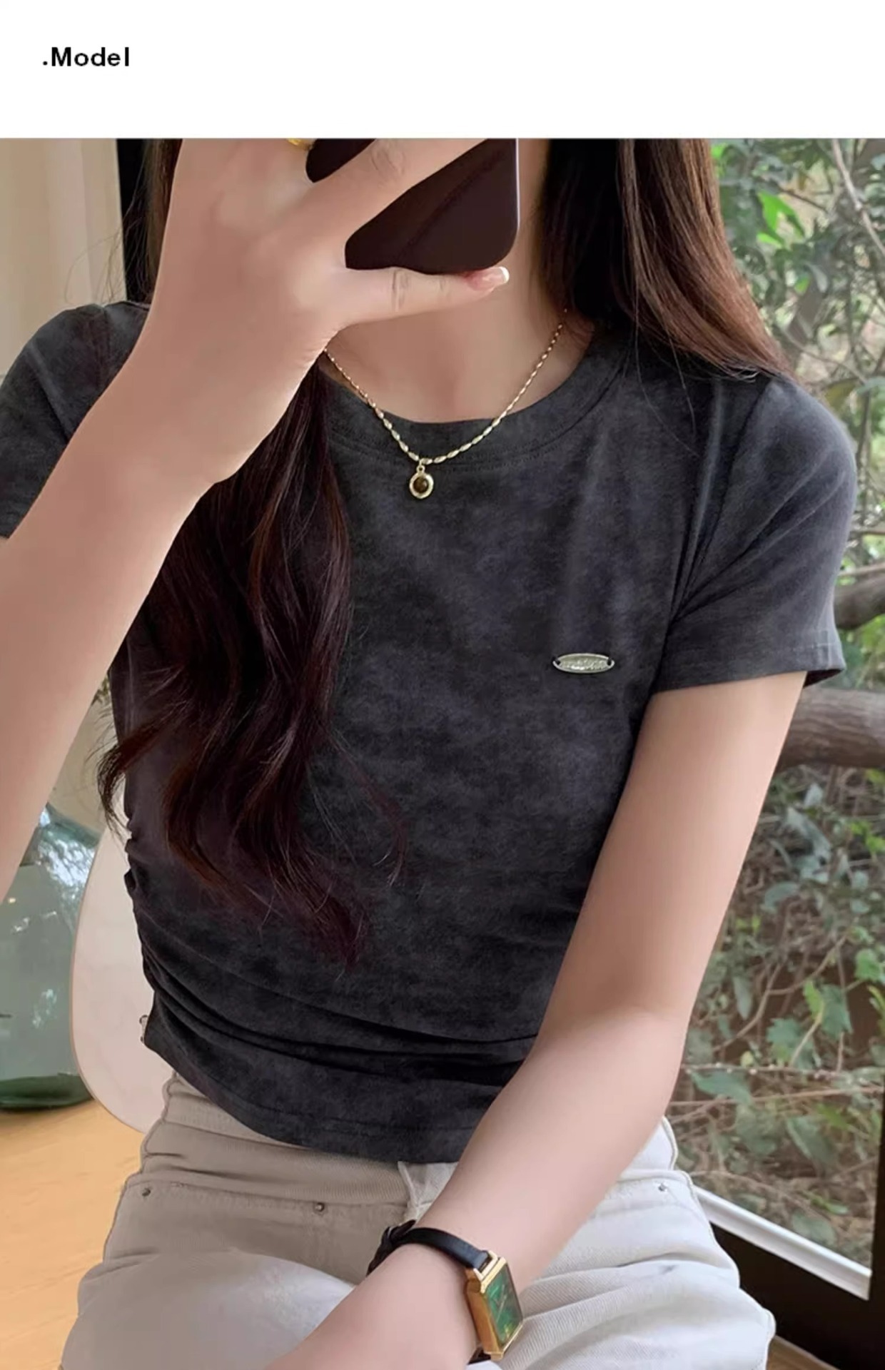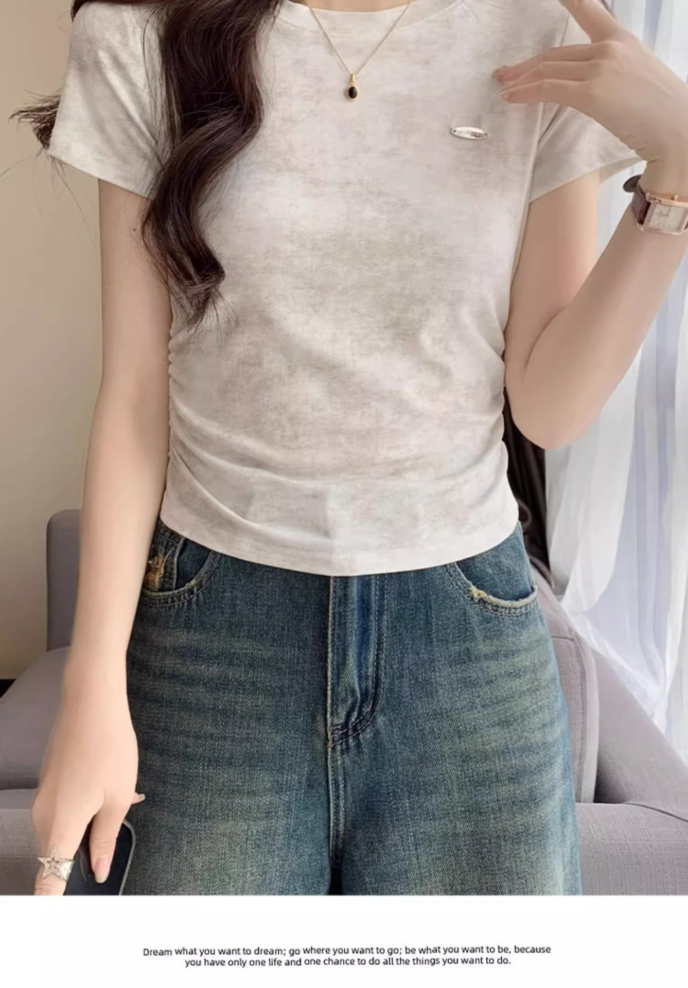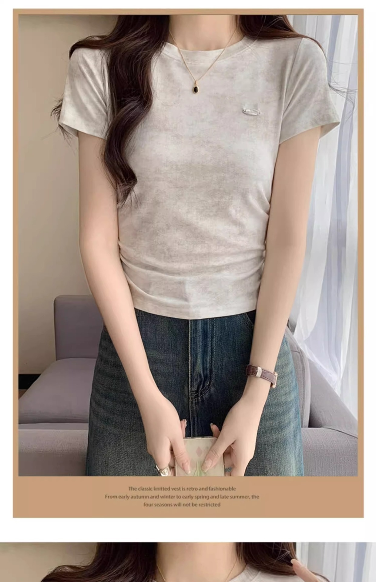 美式圆领正肩短袖t恤女春夏新款设计感抽褶收腰纯欲修身小衫上衣