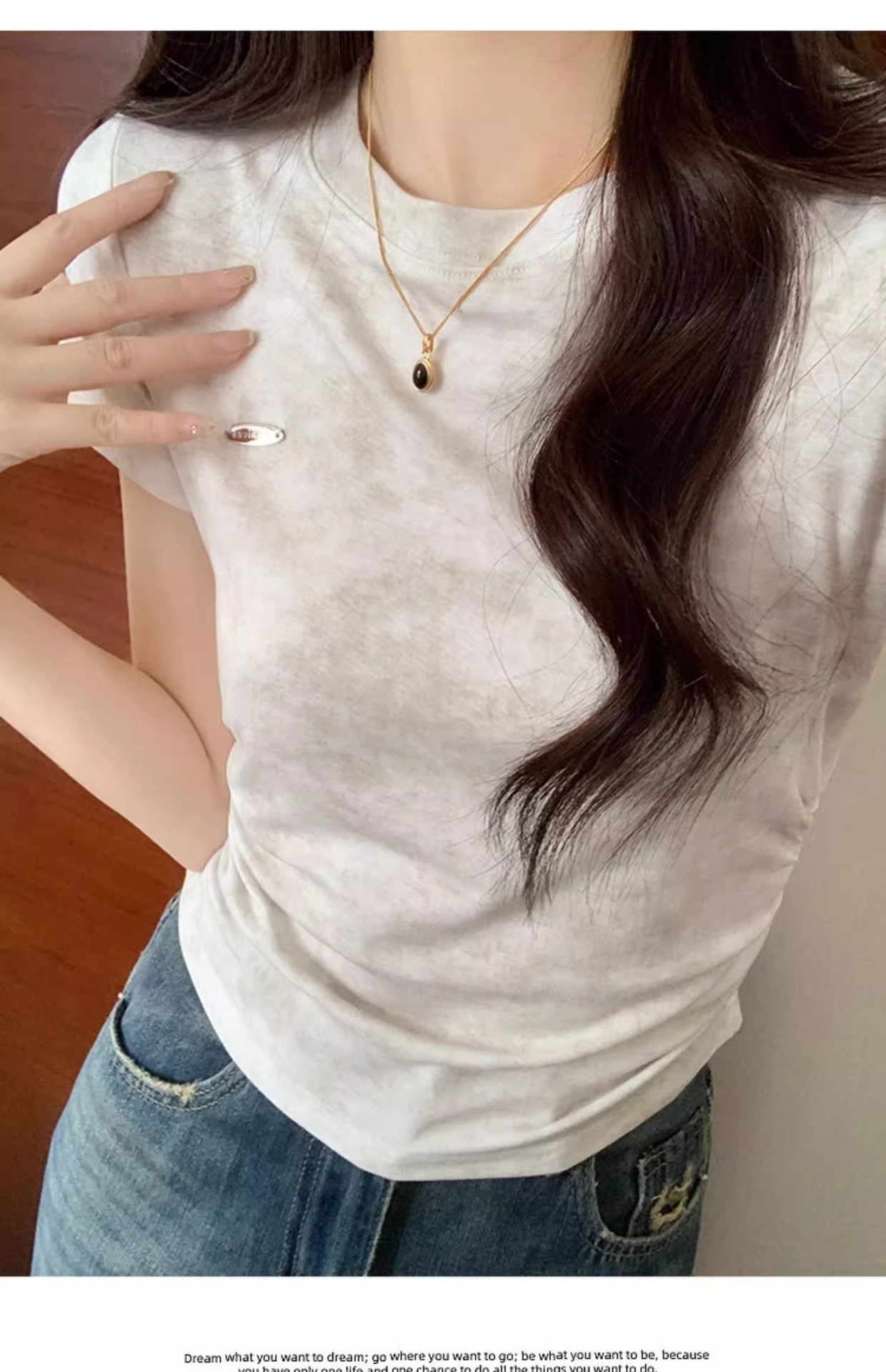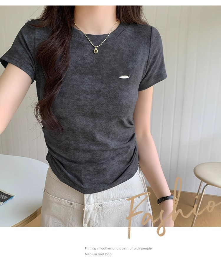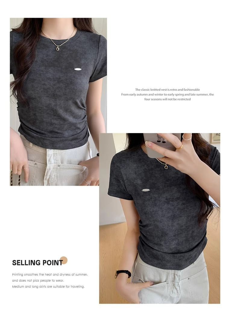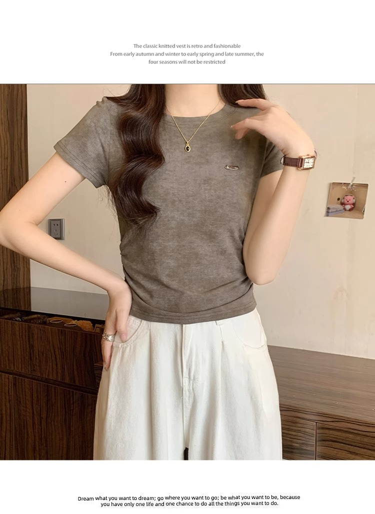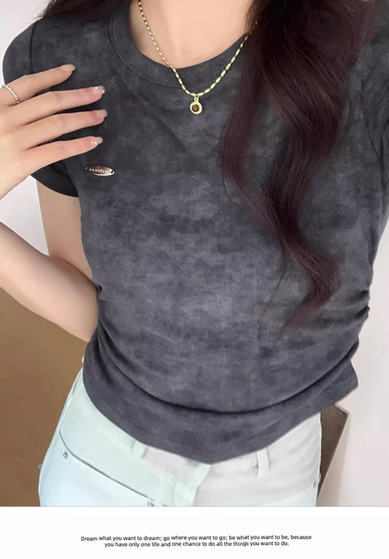 美式圆领正肩短袖t恤女春夏新款设计感抽褶收腰纯欲修身小衫上衣