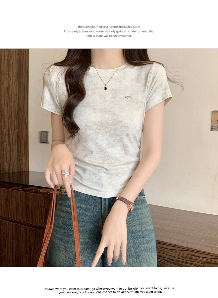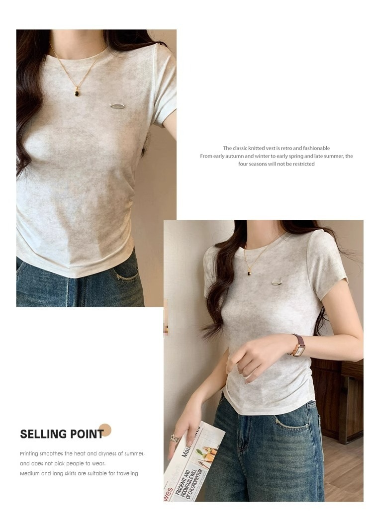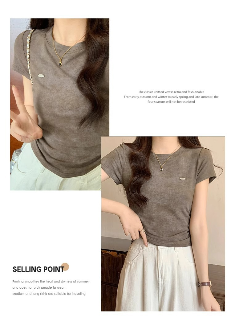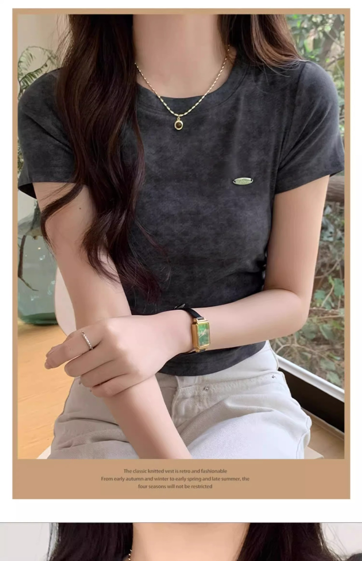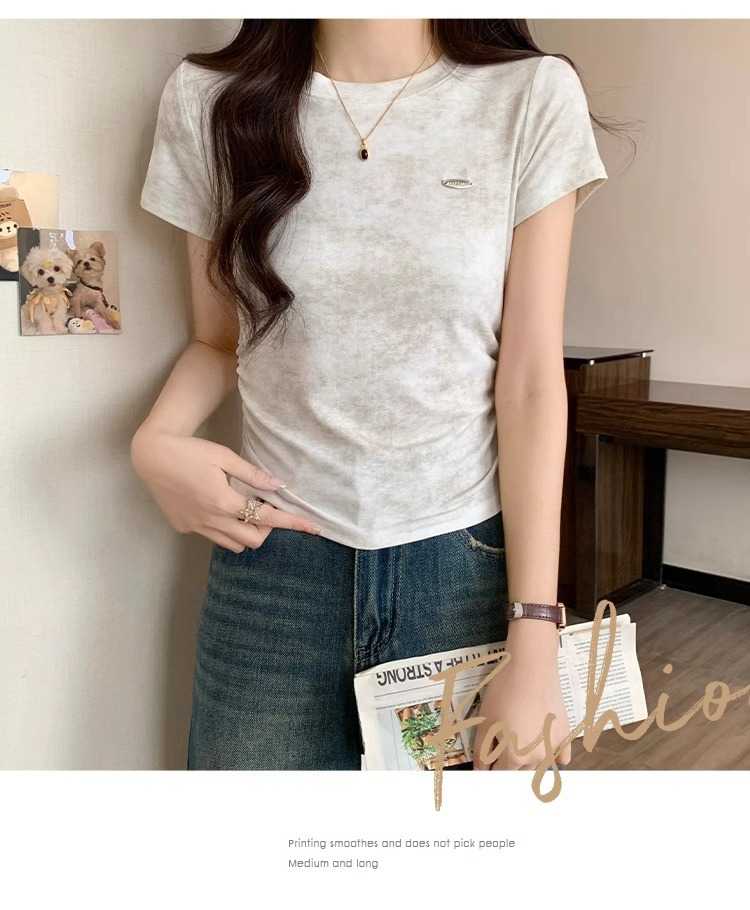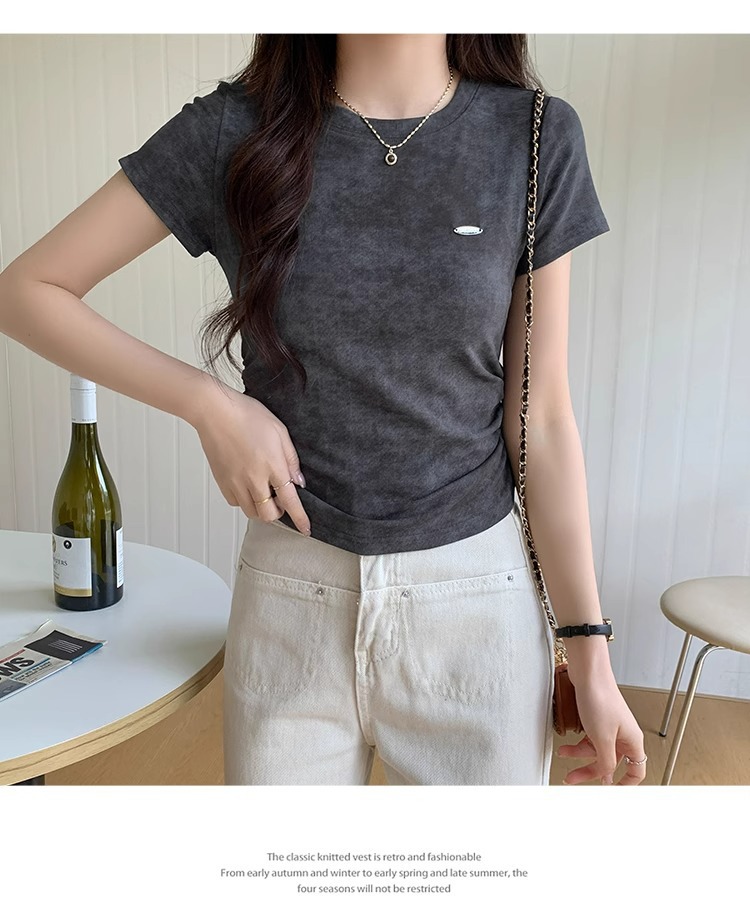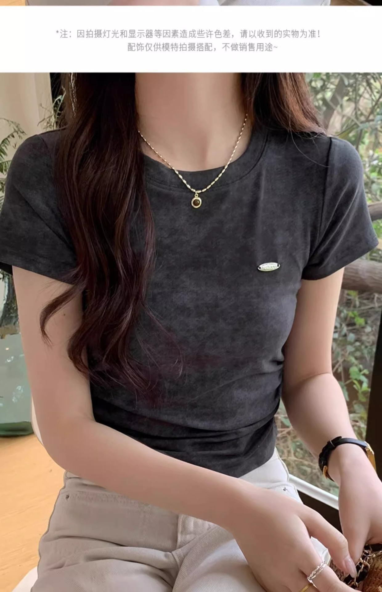 美式圆领正肩短袖t恤女春夏新款设计感抽褶收腰纯欲修身小衫上衣