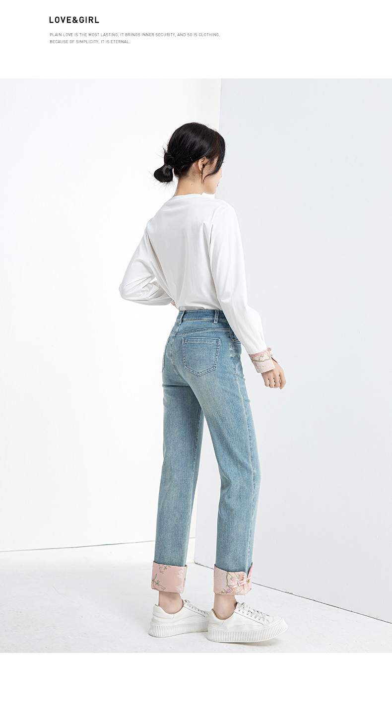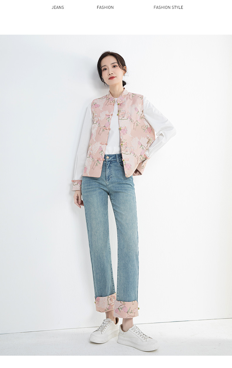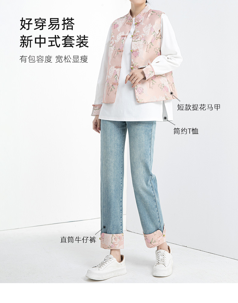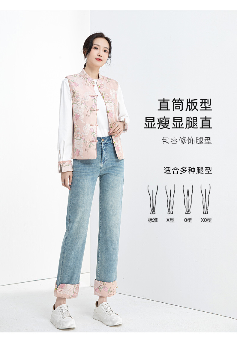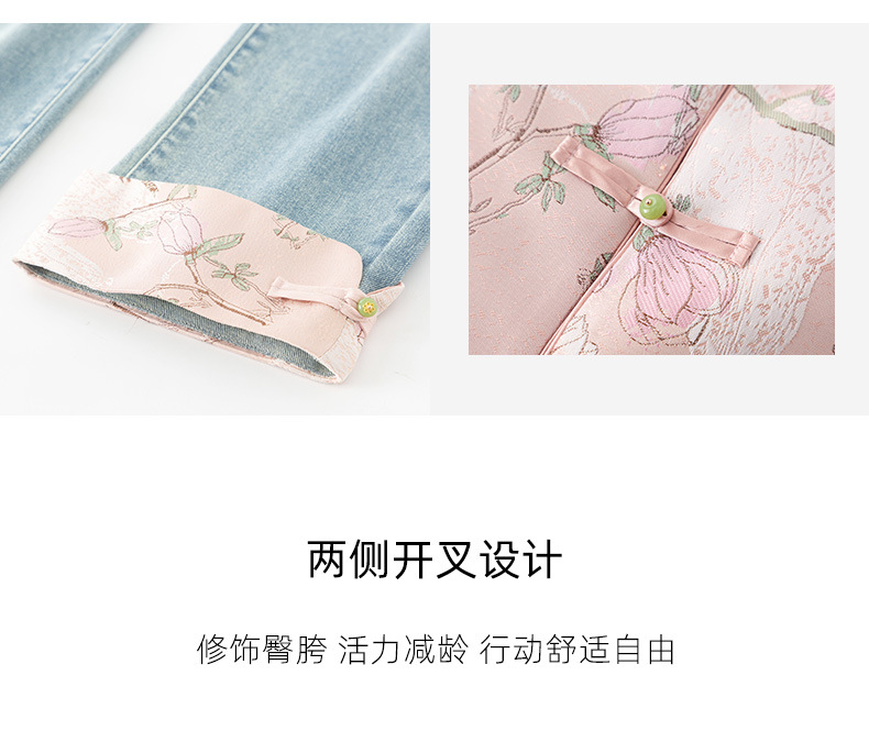 新中式拼接提花直筒裤2026春夏新款高腰显瘦弹力国风牛仔裤