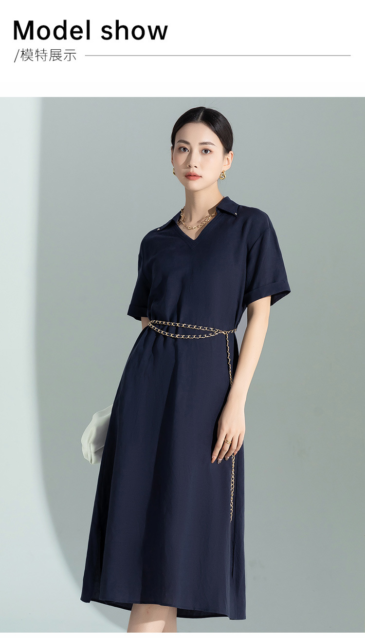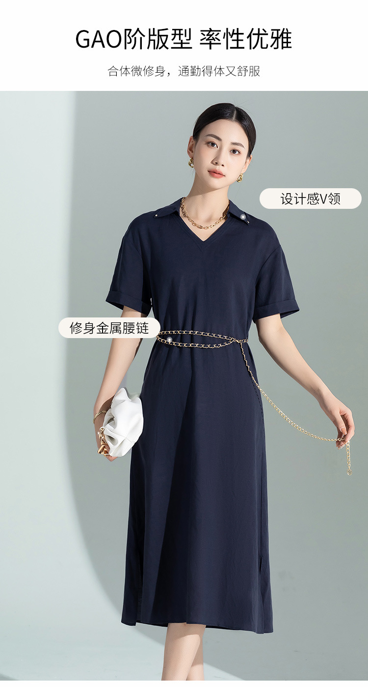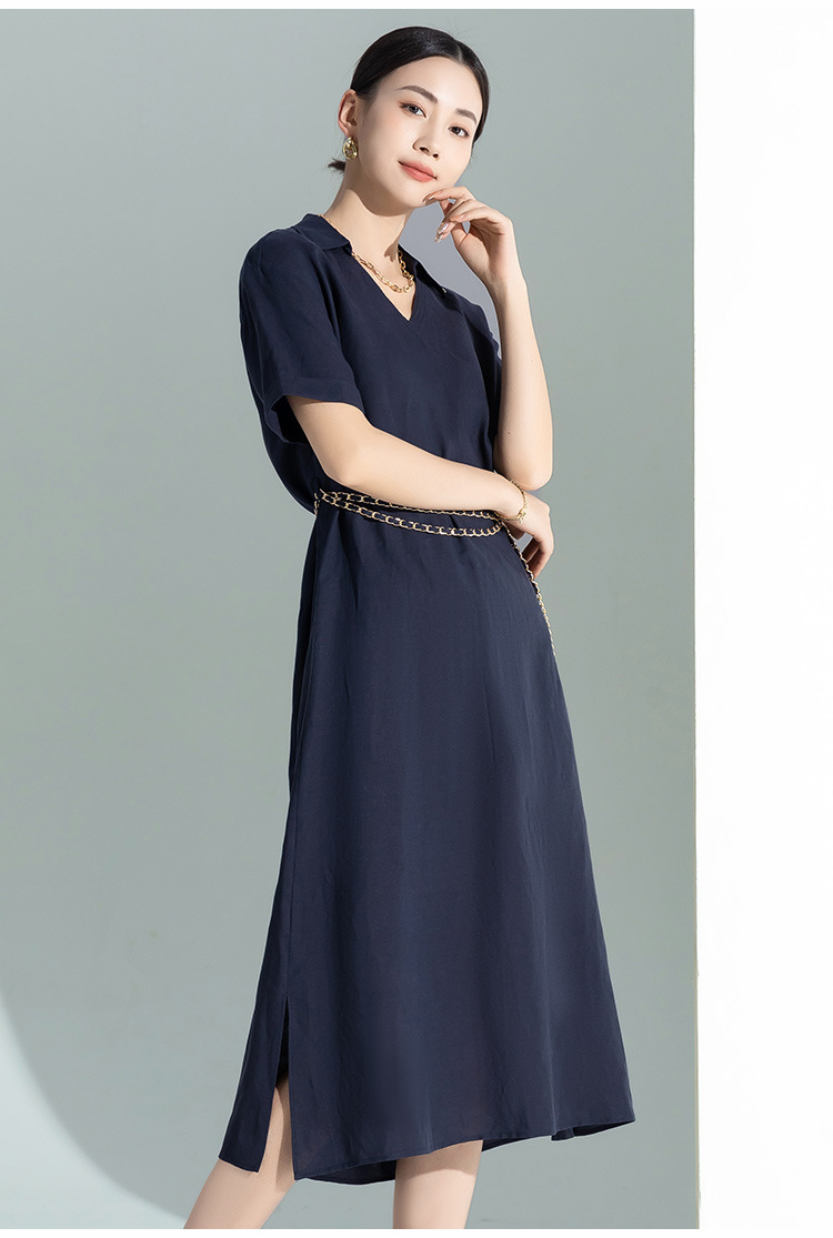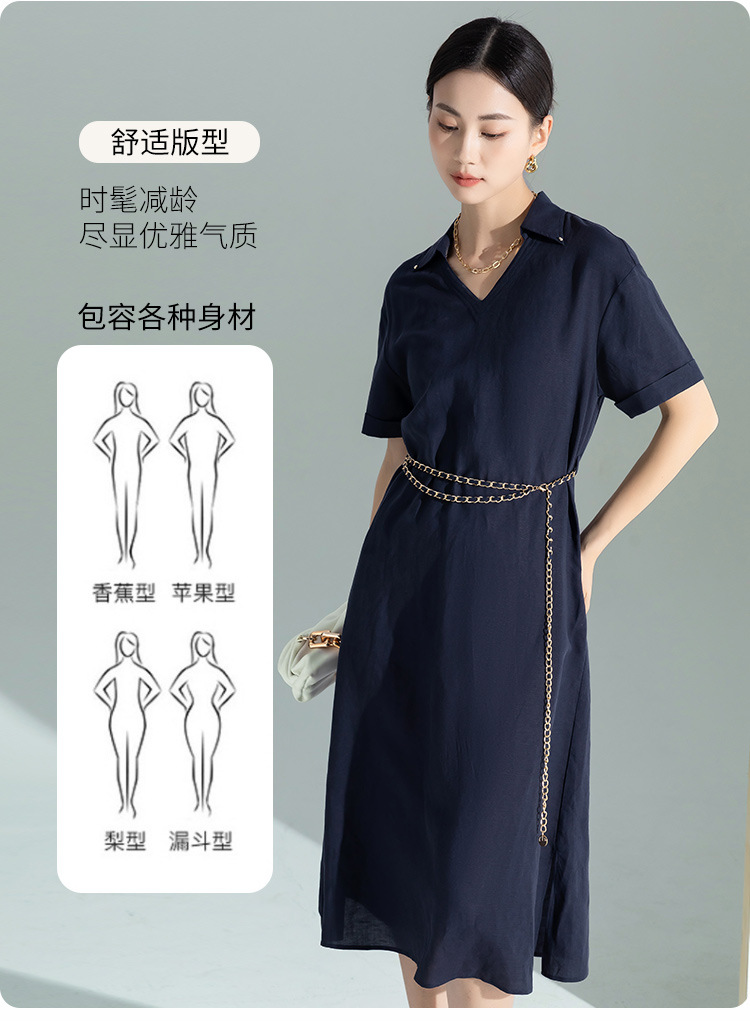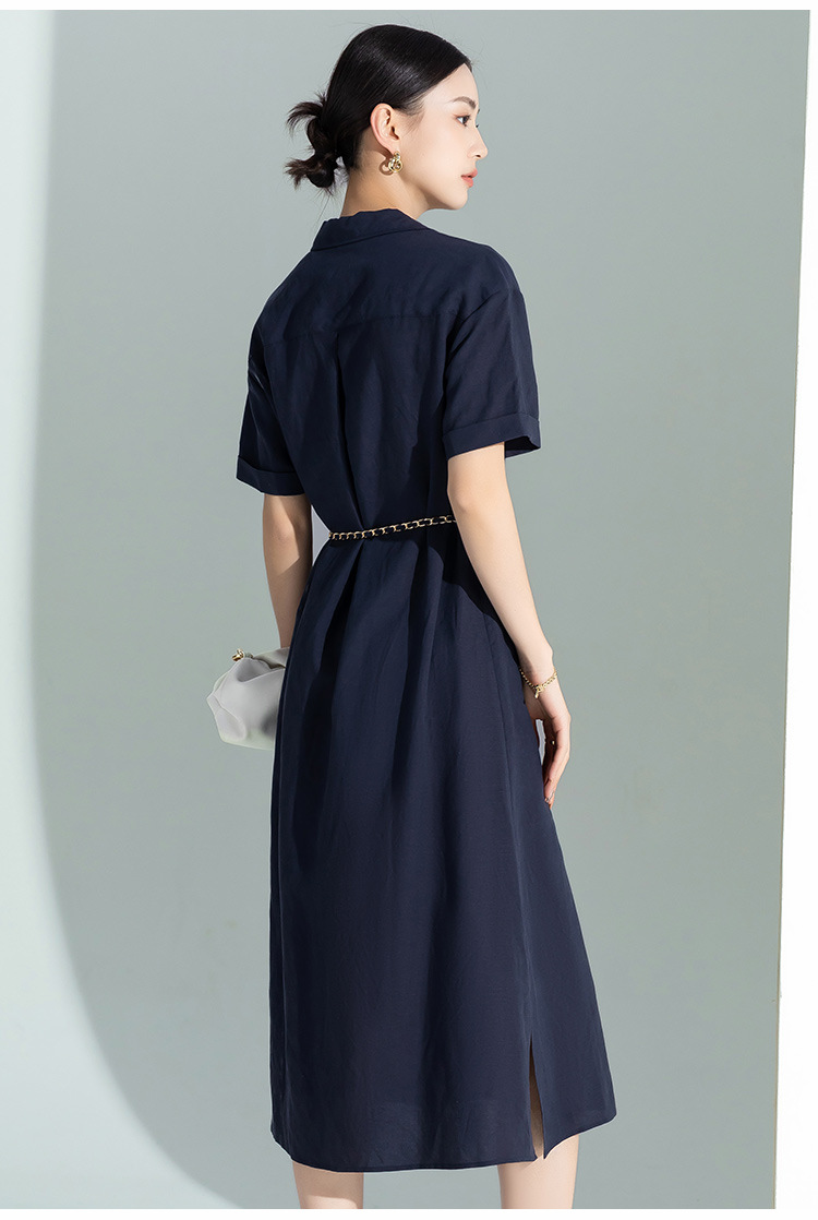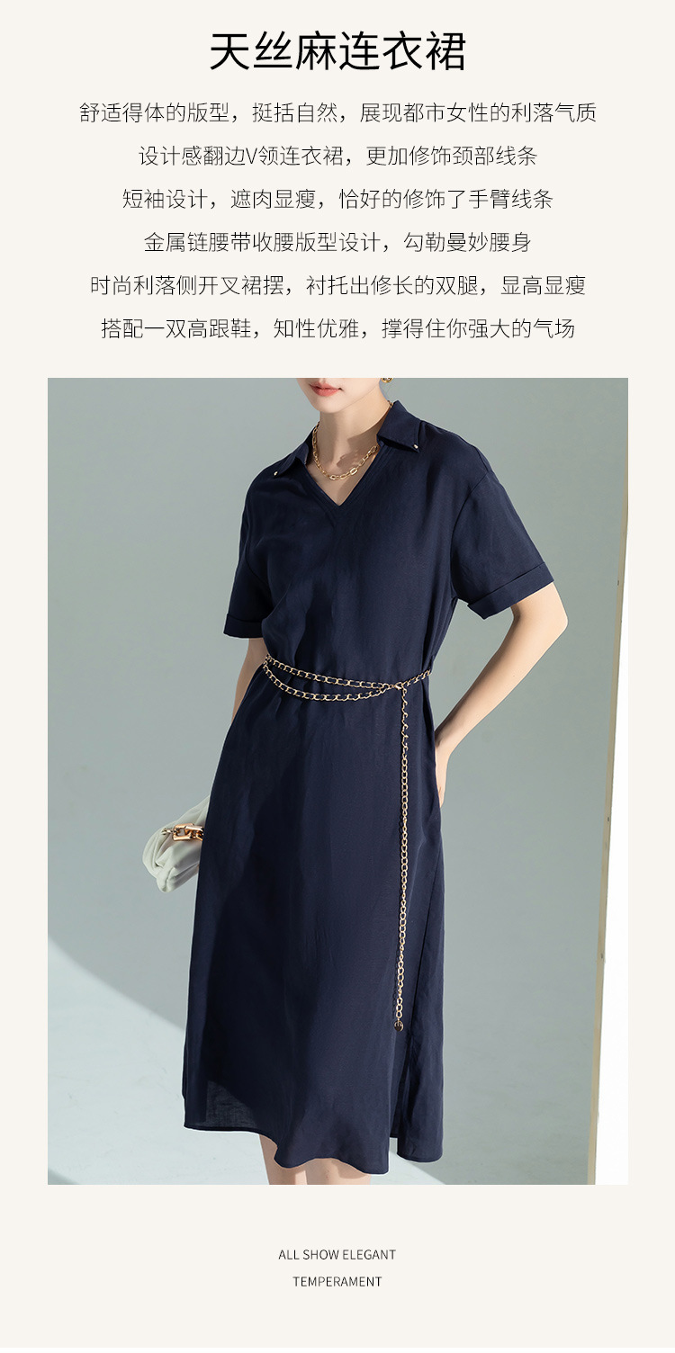 藏蓝色亚麻天丝连衣裙女夏季2026年新款高级感职业时尚收腰裙子女