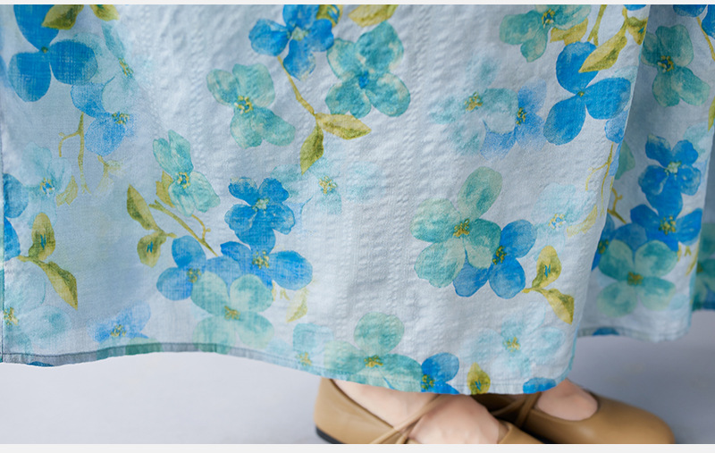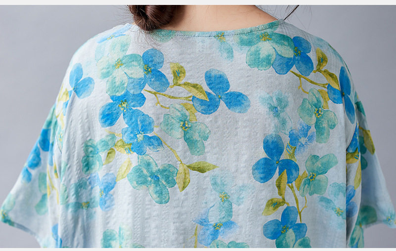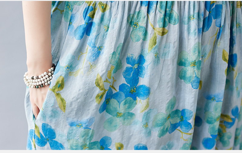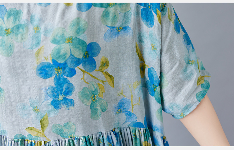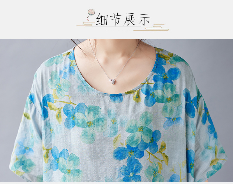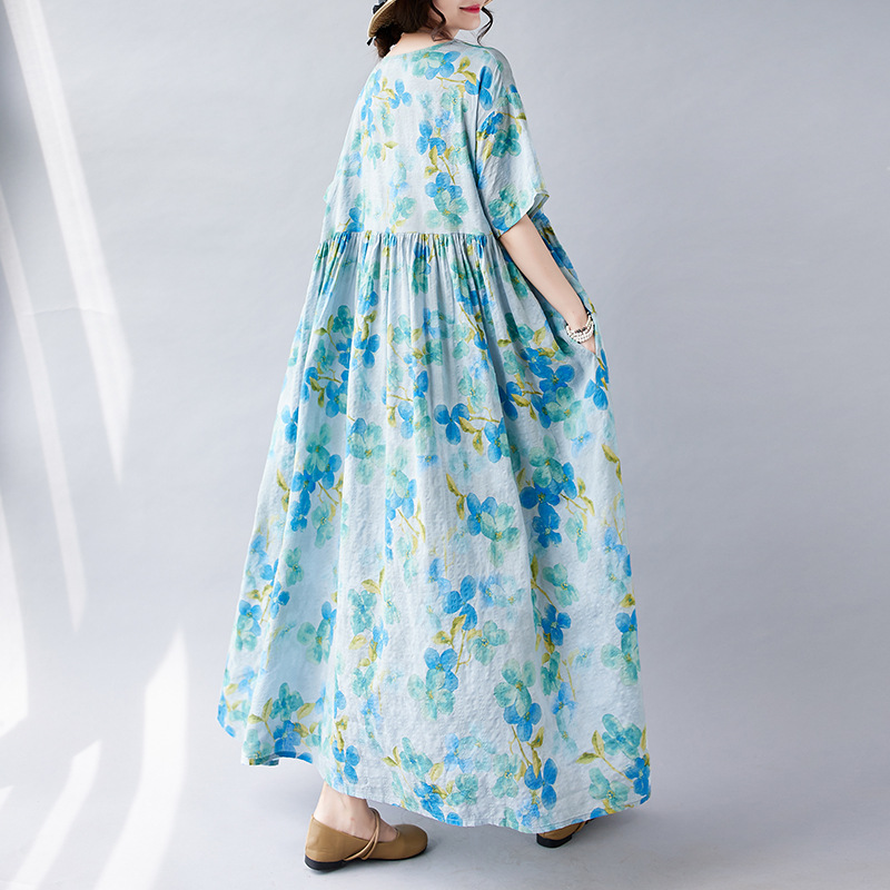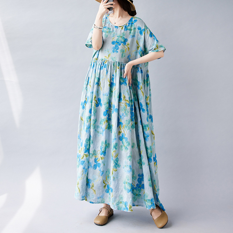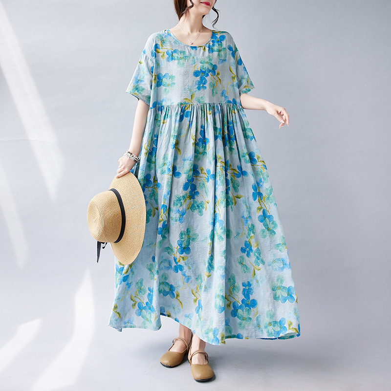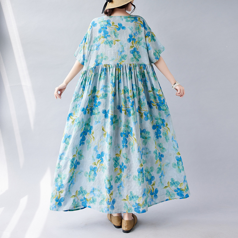 2026简约时尚波西米亚长裙夏季新款加肥加大短袖圆领印花连衣裙