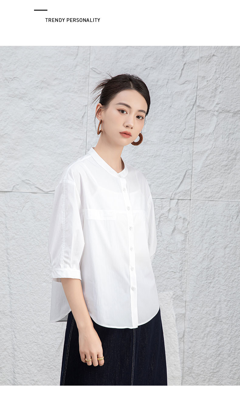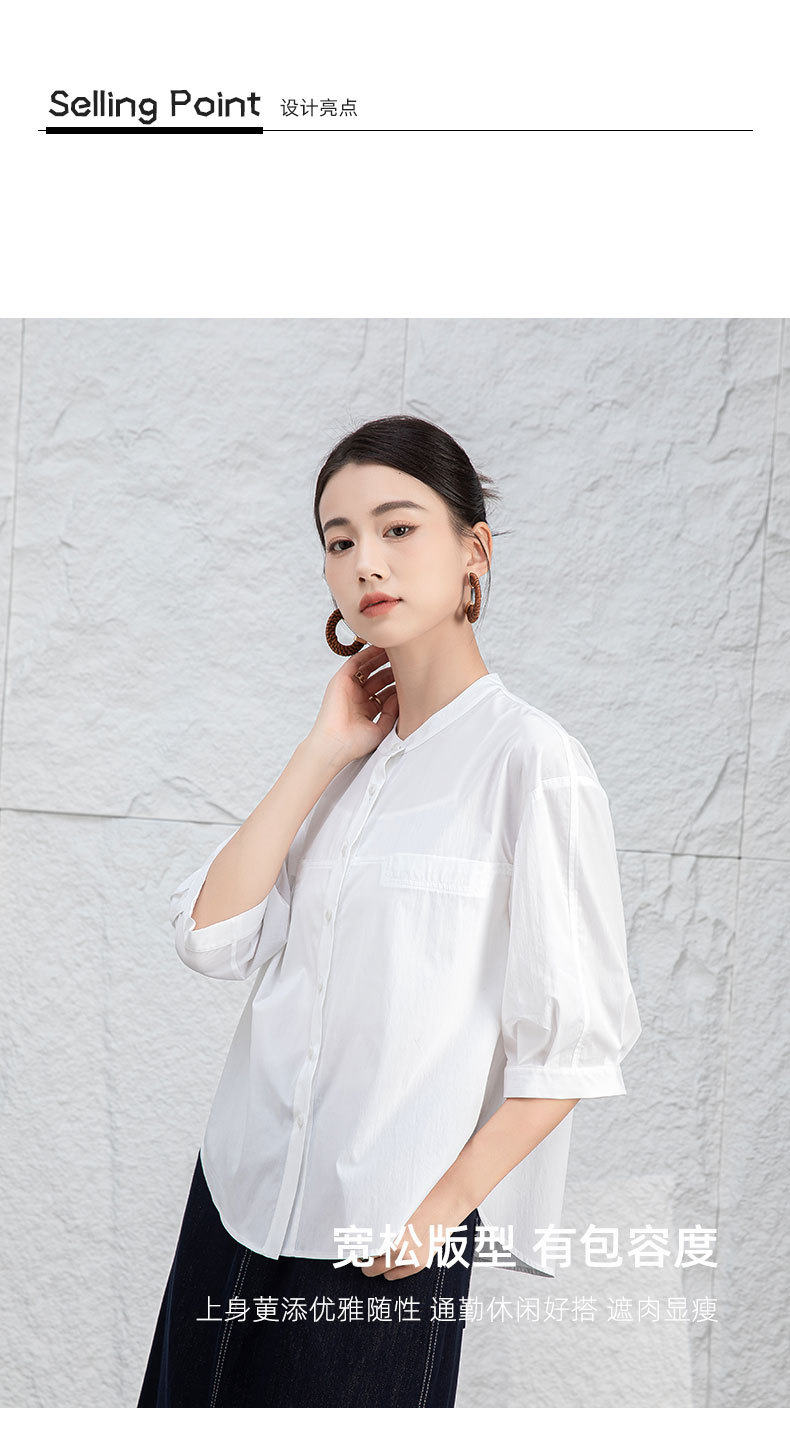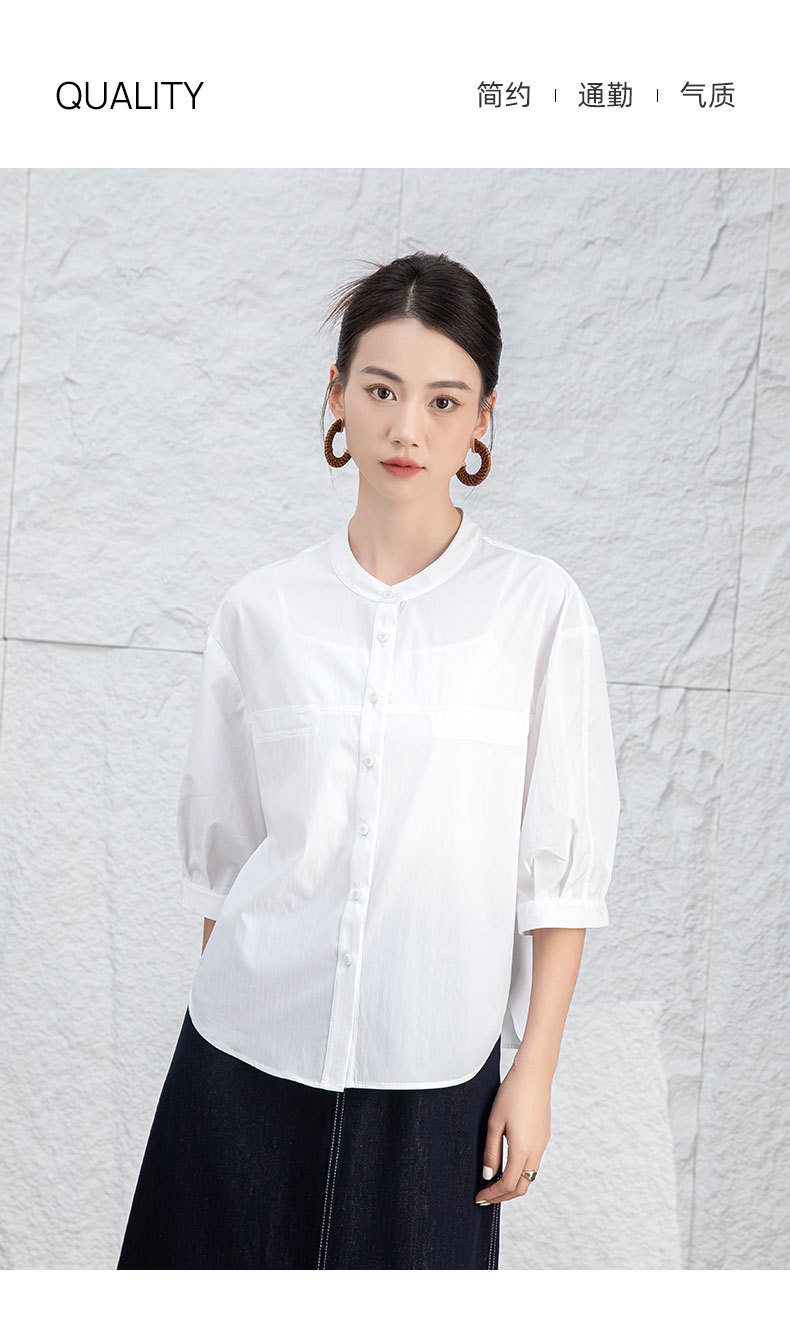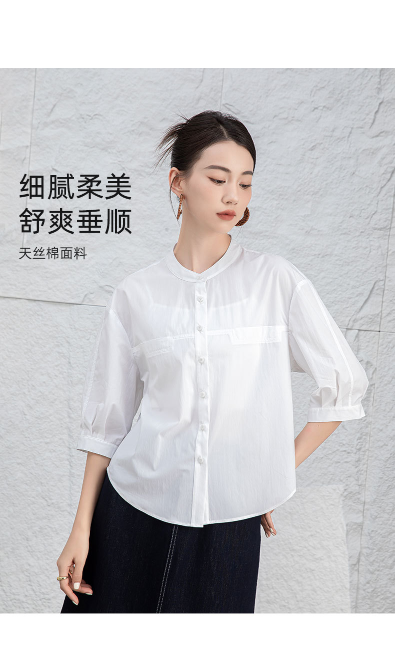 鑫阁 白色五分袖立领女夏设计感宽松中袖衬衣职业通勤天丝棉上衣