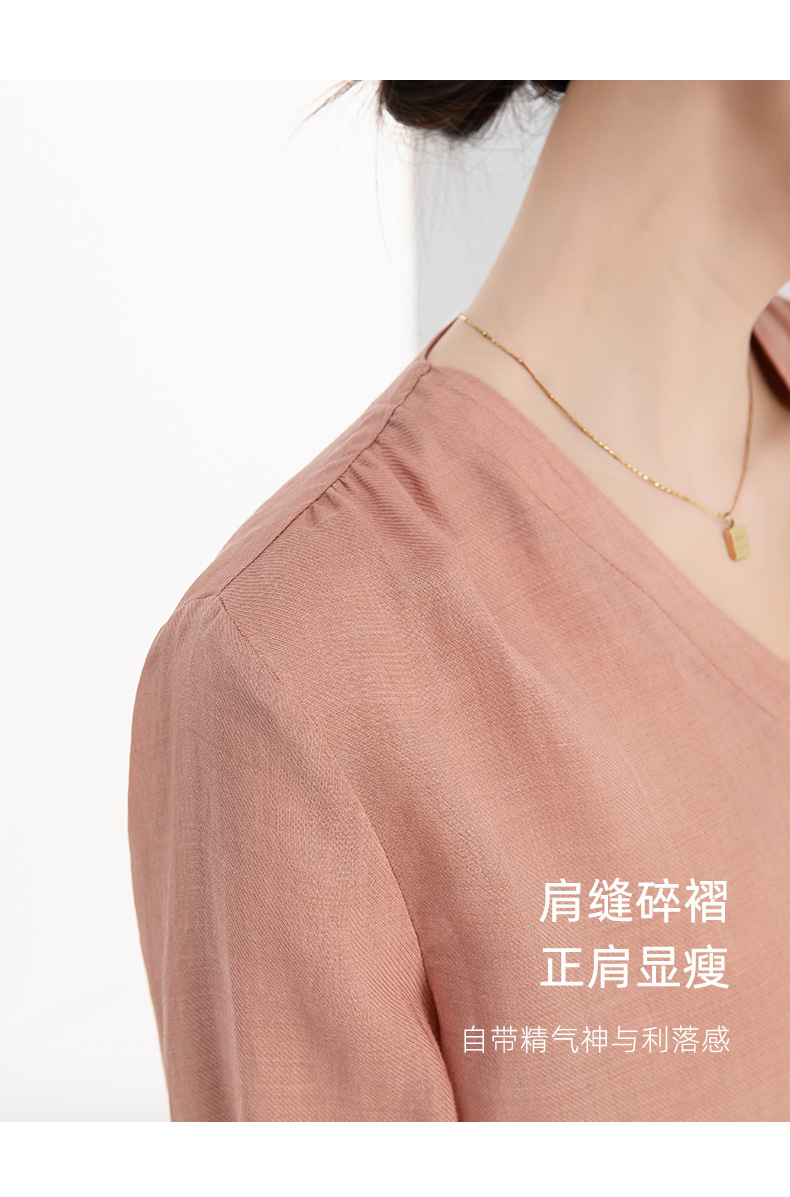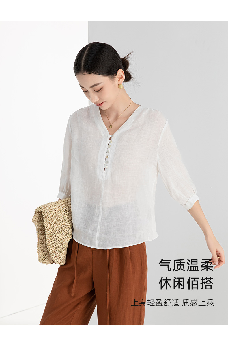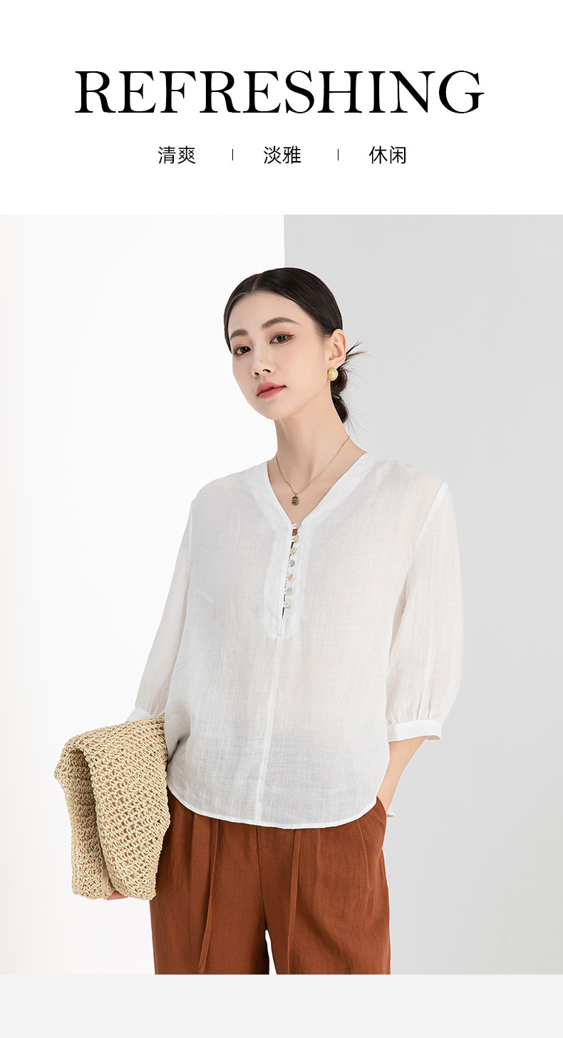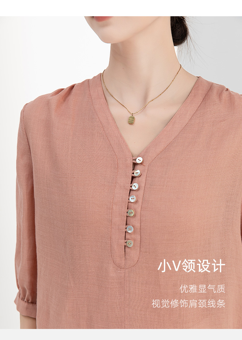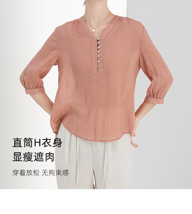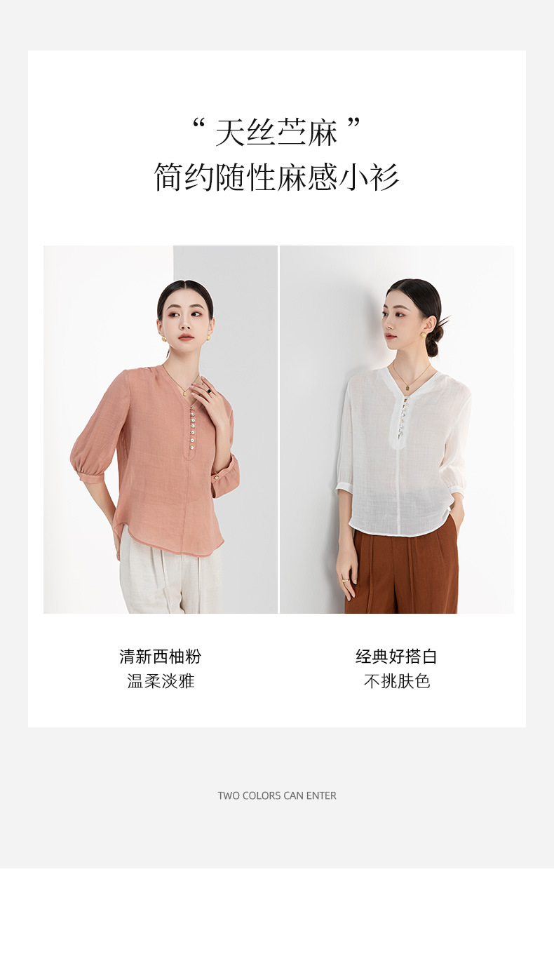 鑫阁 天丝麻贝壳扣V领衬衫2026夏季新款休闲随性佰搭七分袖小衫
